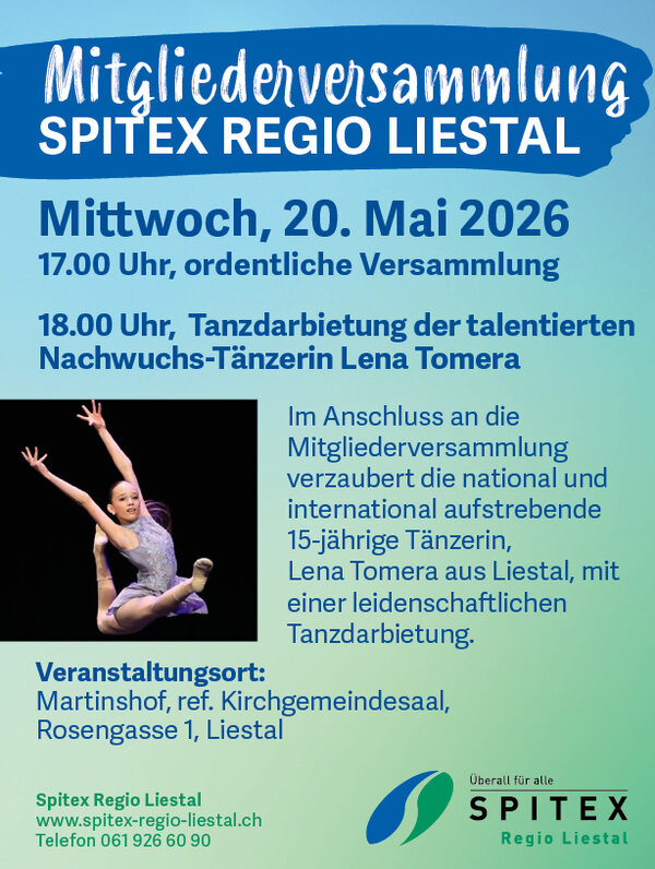 Am Mittwoch, 20. Mai 2026, findet die Mitgliederversammlung der Spitex Regio Liestal statt. Gemeinsam blicken wir auf das vergangene Jahr zurück und richten den Fokus auf kommende Entwicklungen.